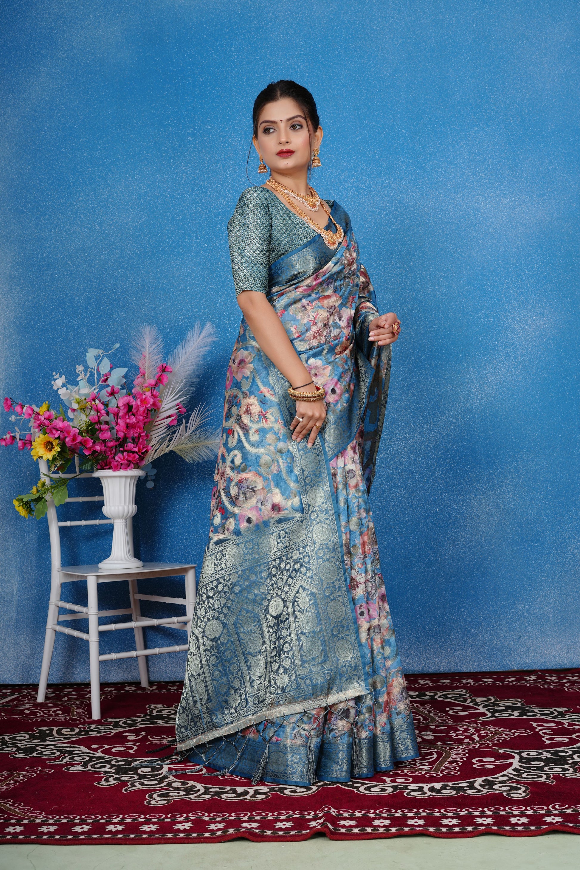 Drape yourself in timeless elegance with our Woven Art Silk Saree in a captivating blue hue. This exquisite drape is beautifully enhanced with tassels, a digital floral print, and intricate zari ornamental motifs. It comes complete with a matching unstitched art silk blouse.