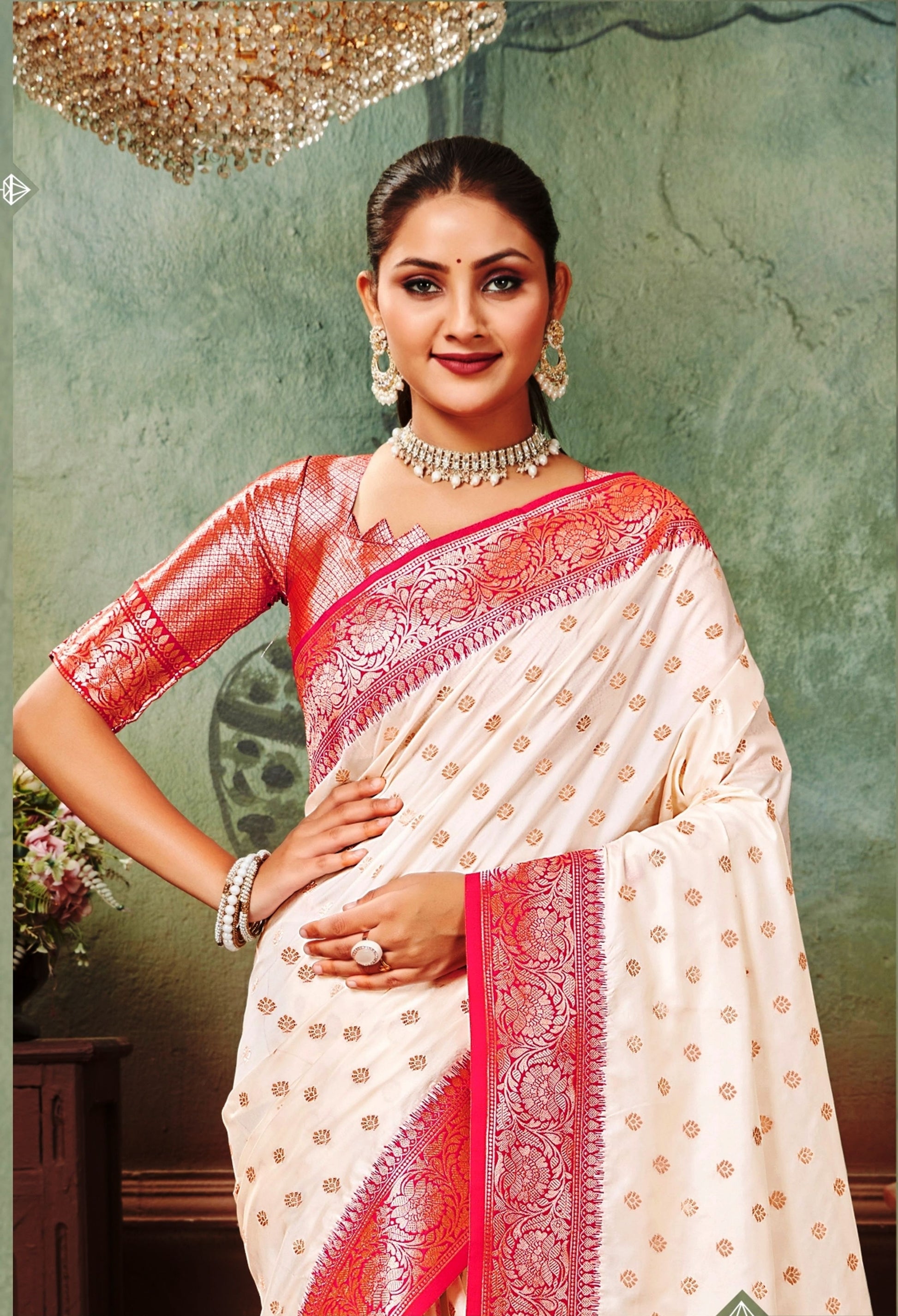 This elegant Off White Woven Art Silk Saree is an exquisite choice for special occasions. It showcases intricate Zari woven floral motifs, perfectly complemented by a contrasting unstitched pink Art Silk blouse. Ideal for wedding wear, this saree embodies timeless grace and sophistication.